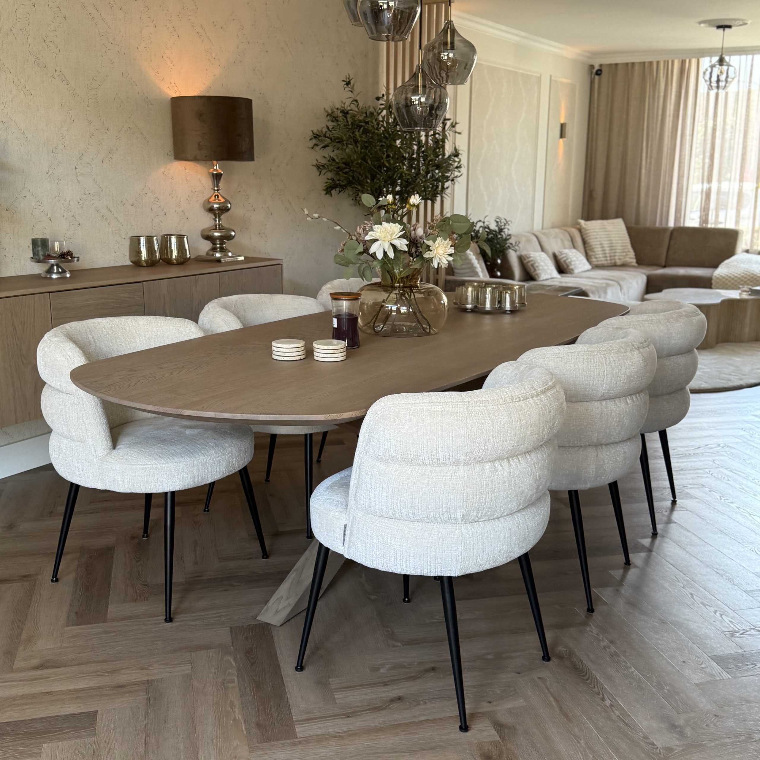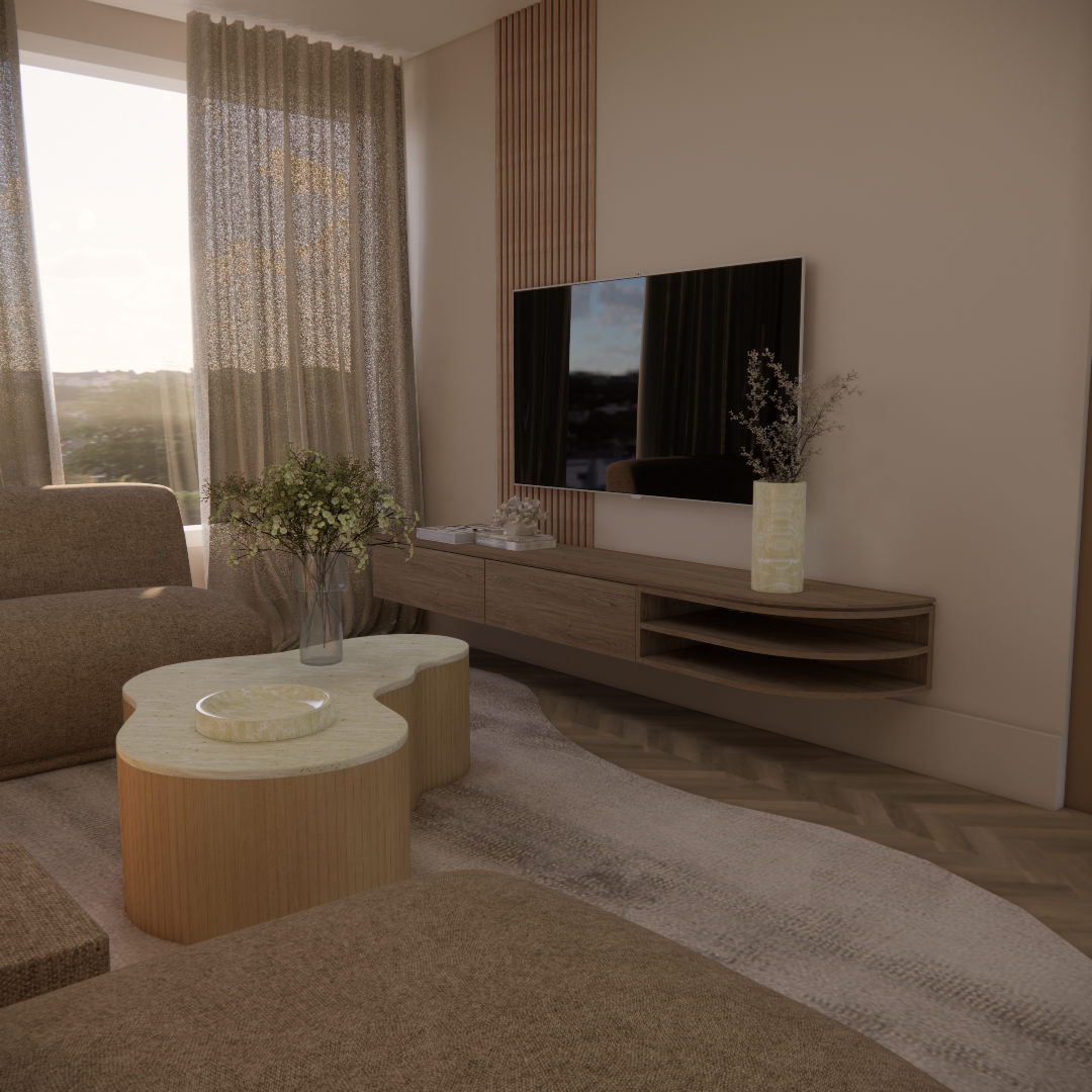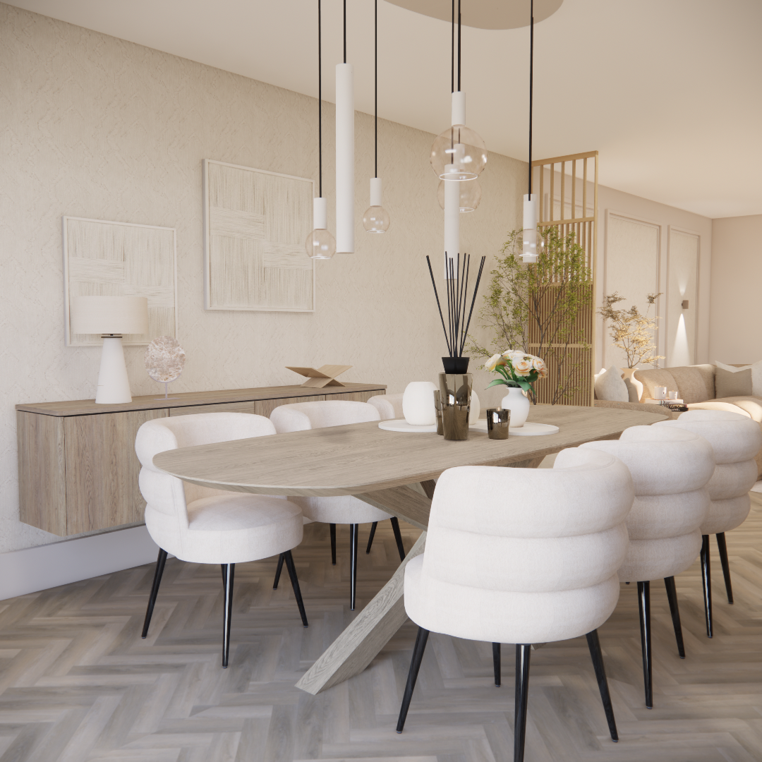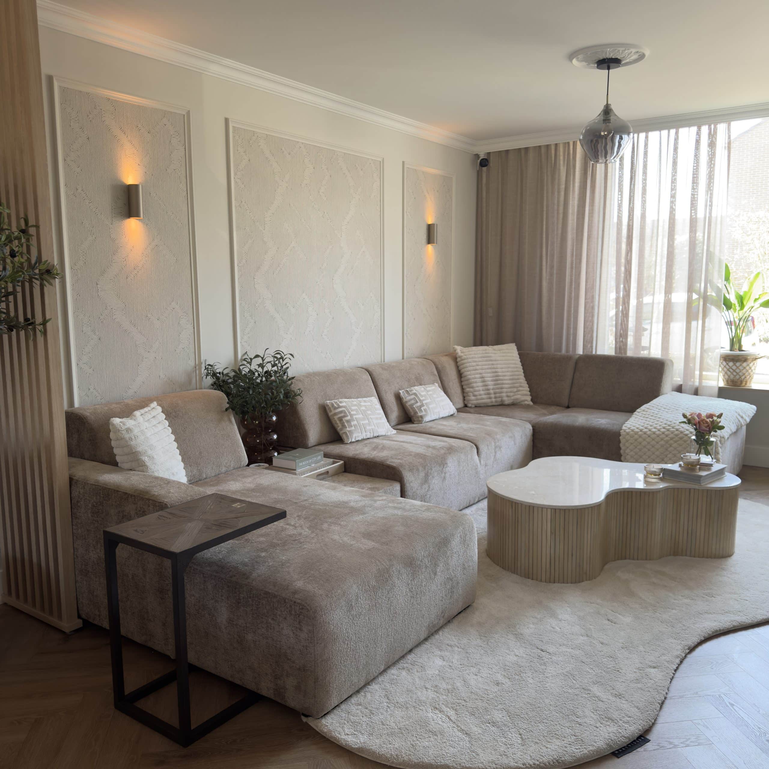 Aan de hand van een 3D-interieuradvies is het ontwerp tot in detail uitgewerkt. De kracht van dit interieur zit in de subtiele doorbreking van de rechte lijnen van de woning. Door het consequent toepassen van ronde en organische vormen ontstaat een zachtere, meer uitgebalanceerde uitstraling. Deze belijning komt terug in onder andere het maatwerk meubilair, het vloerkleed en de eethoek, waardoor er een duidelijke samenhang voelbaar is zonder dat het geforceerd oogt.