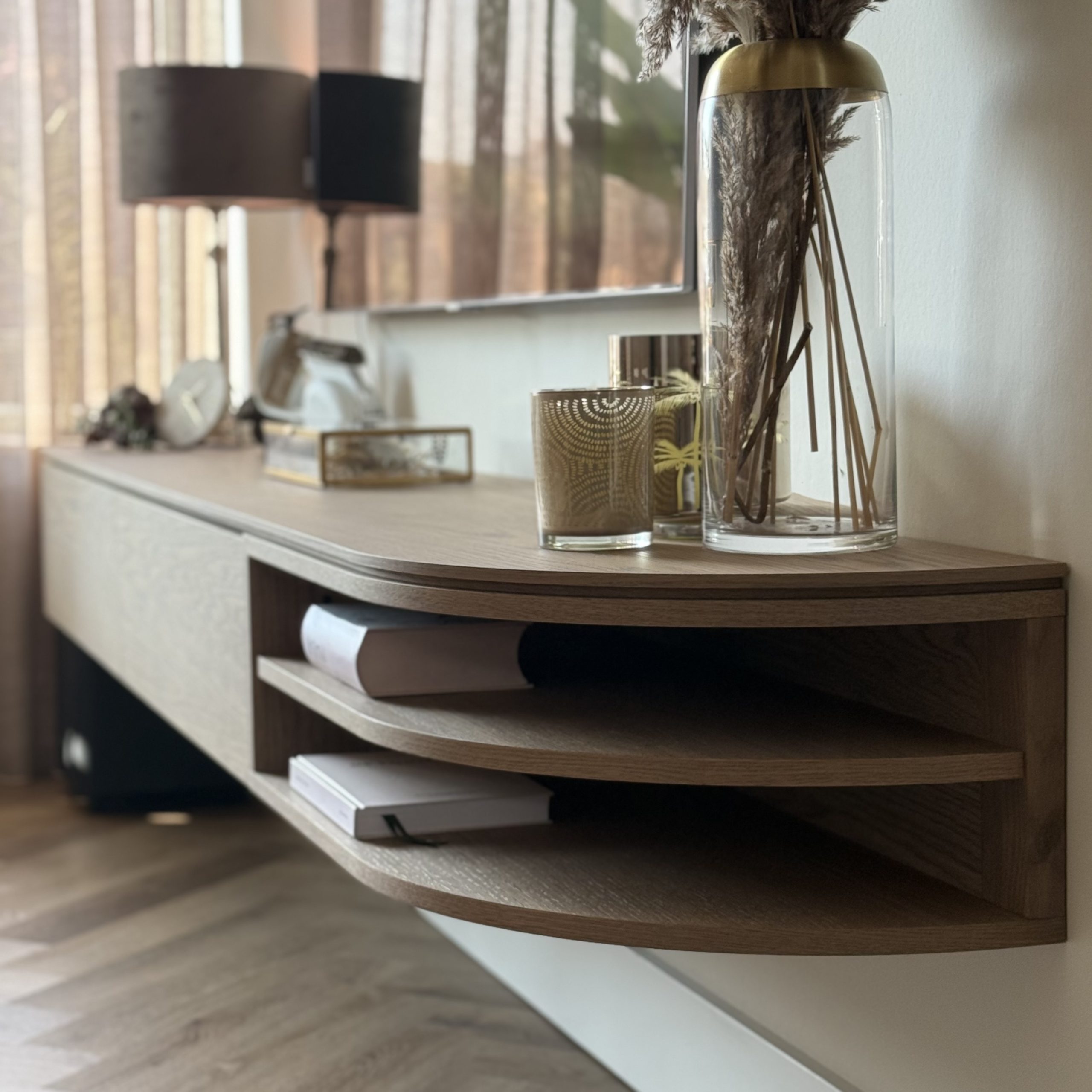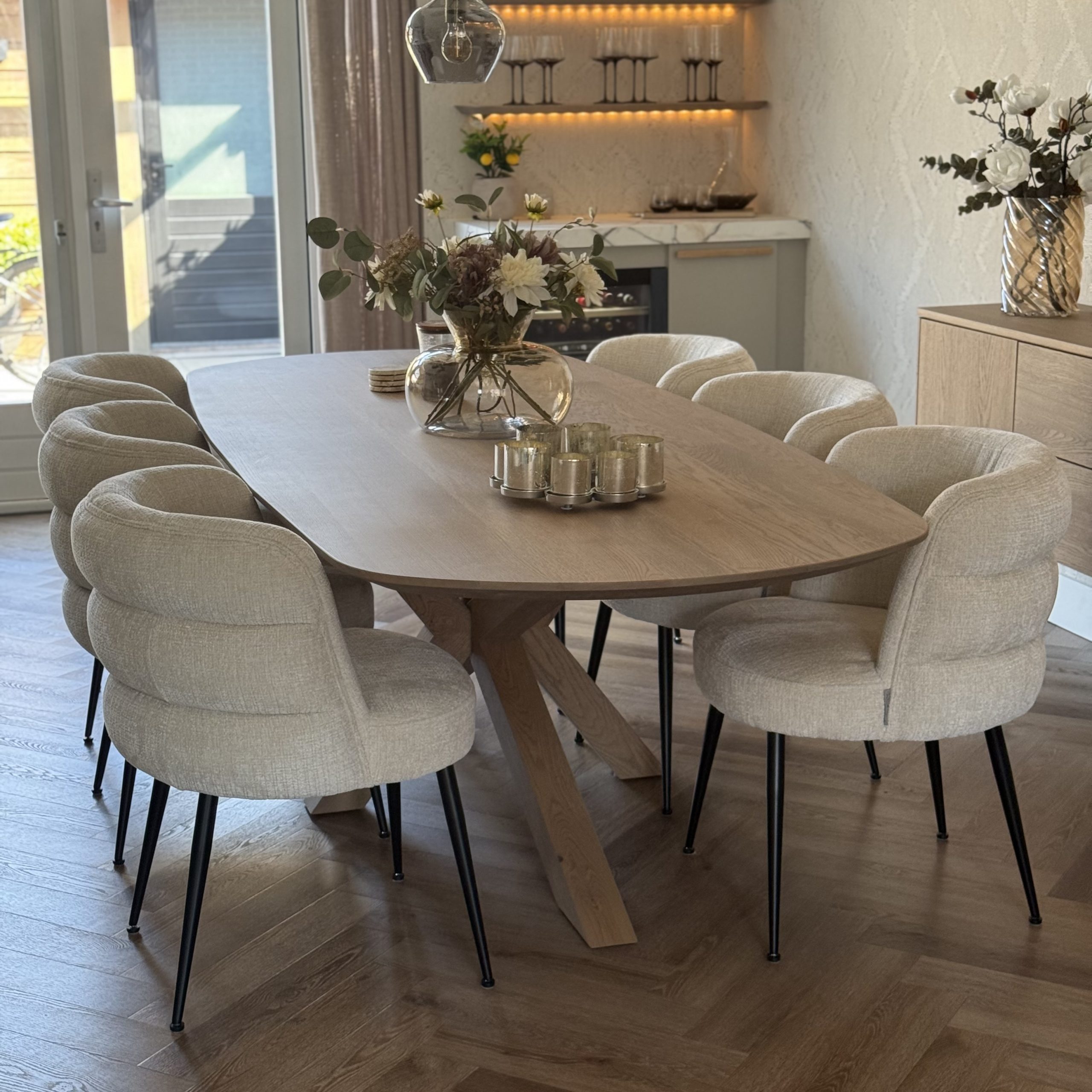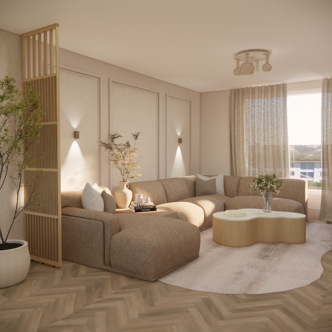 Aan de hand van een 3D-interieuradvies is het ontwerp tot in detail uitgewerkt. De kracht van dit interieur zit in de subtiele doorbreking van de rechte lijnen van de woning. Door het consequent toepassen van ronde en organische vormen ontstaat een zachtere, meer uitgebalanceerde uitstraling. Deze belijning komt terug in onder andere het maatwerk meubilair, het vloerkleed en de eethoek, waardoor er een duidelijke samenhang voelbaar is zonder dat het geforceerd oogt.