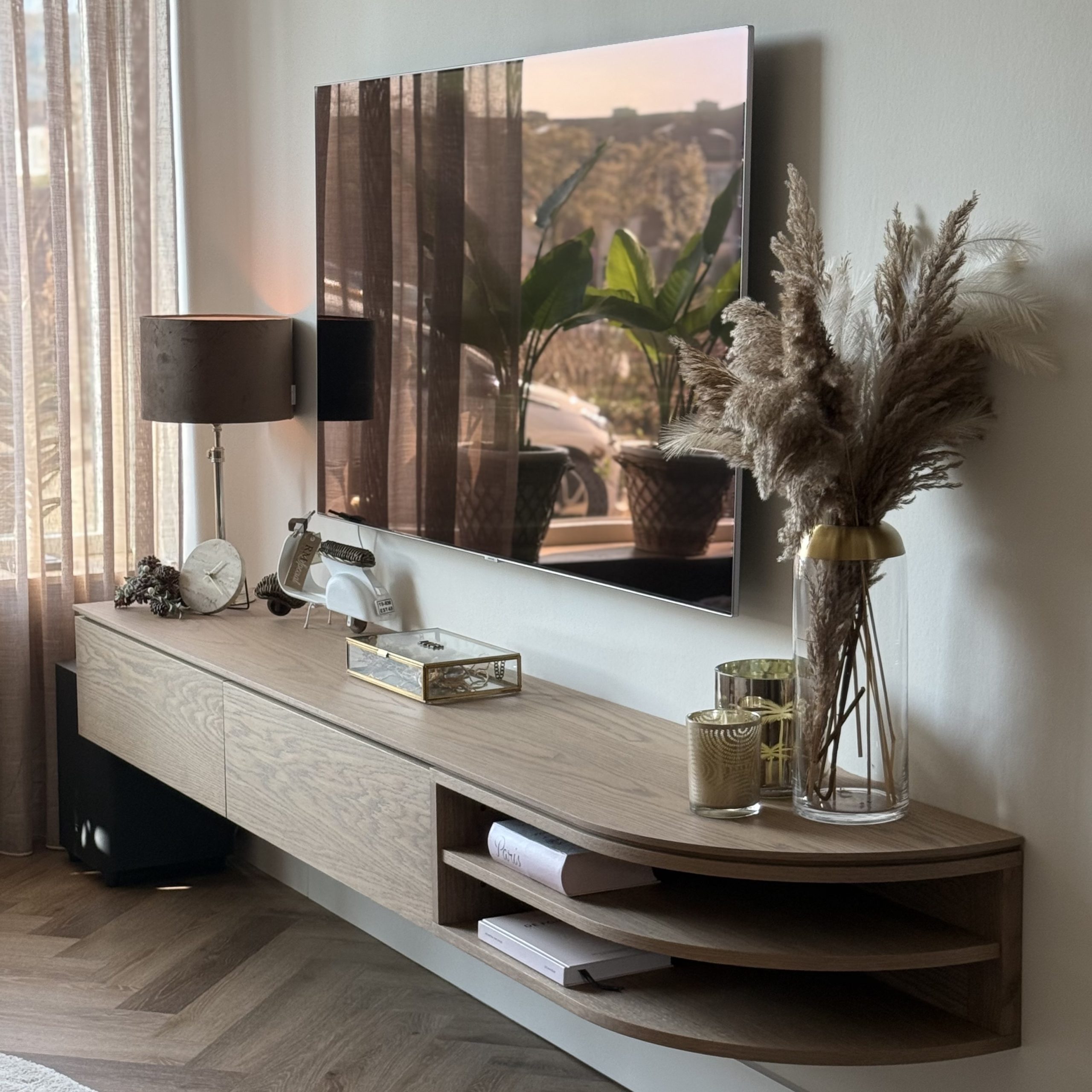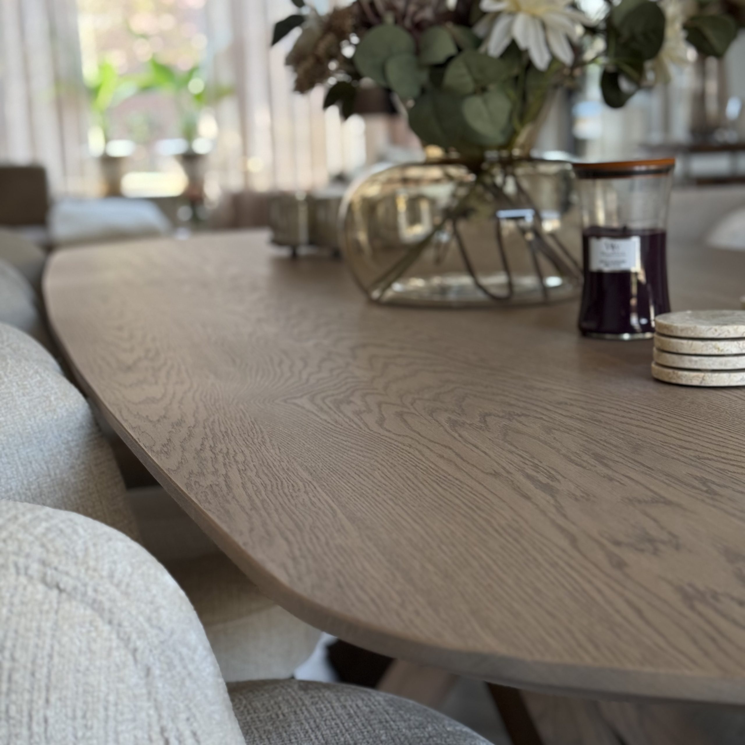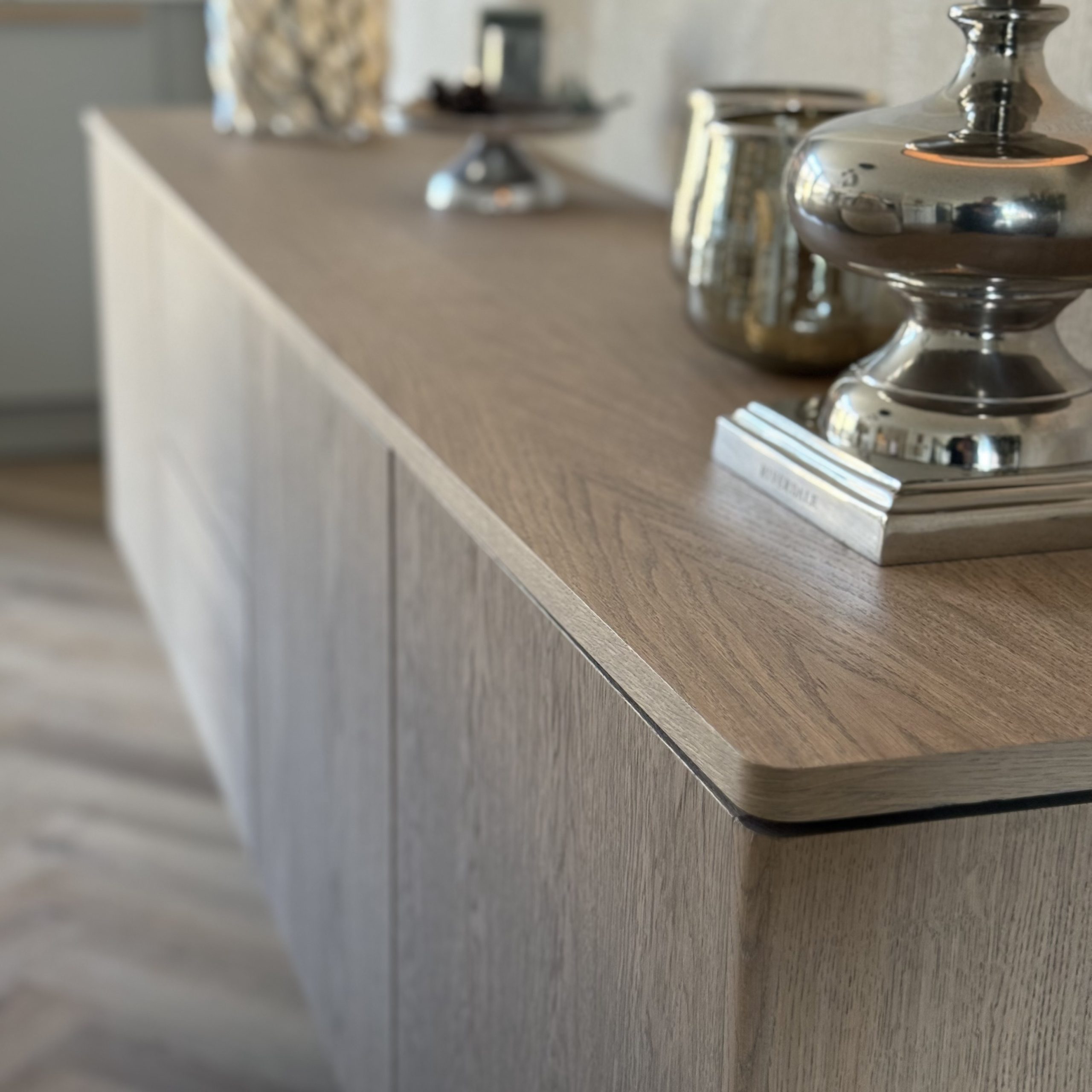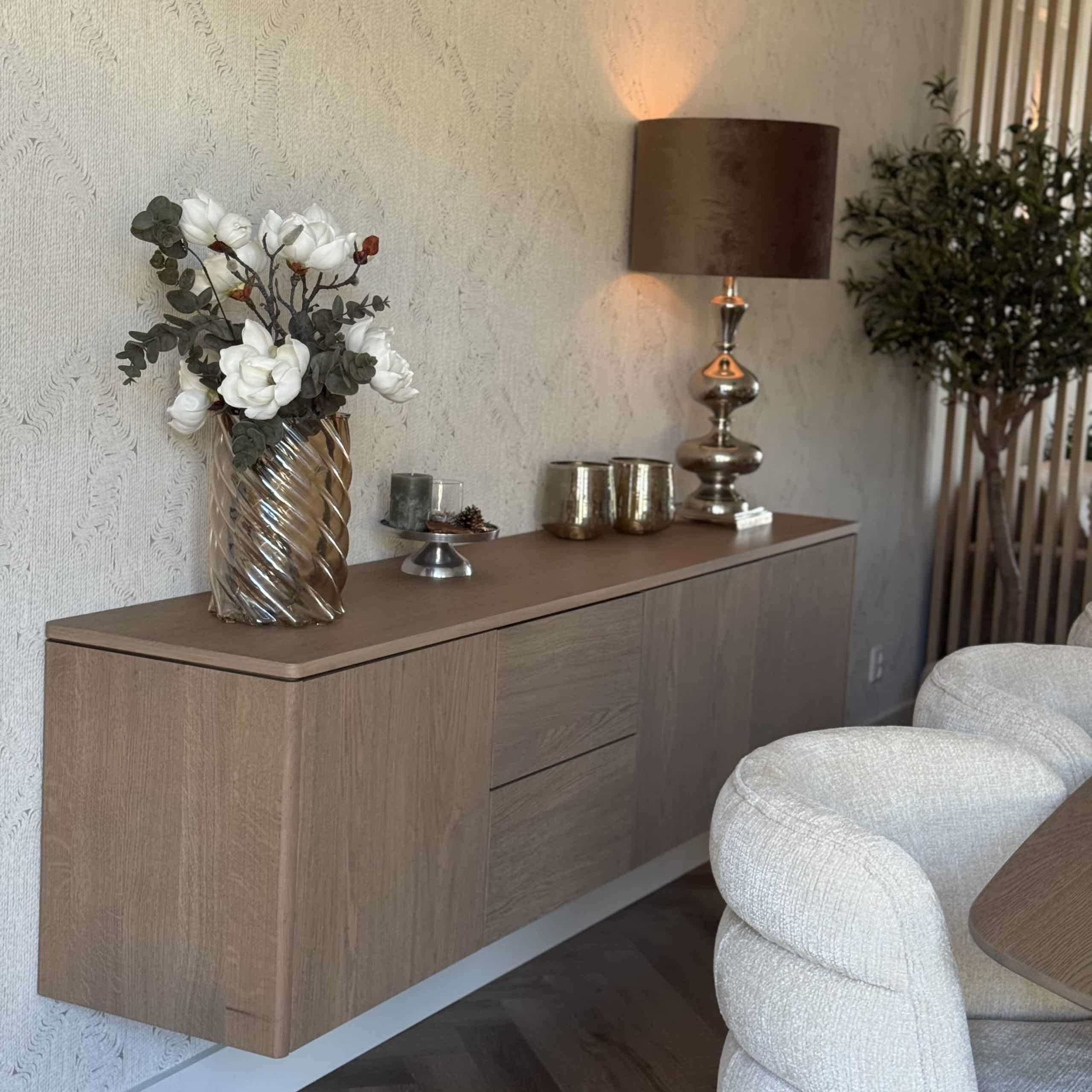Aan de hand van een 3D-interieuradvies is het ontwerp tot in detail uitgewerkt. De kracht van dit interieur zit in de subtiele doorbreking van de rechte lijnen van de woning. Door het consequent toepassen van ronde en organische vormen ontstaat een zachtere, meer uitgebalanceerde uitstraling. Deze belijning komt terug in onder andere het maatwerk meubilair, het vloerkleed en de eethoek, waardoor er een duidelijke samenhang voelbaar is zonder dat het geforceerd oogt.